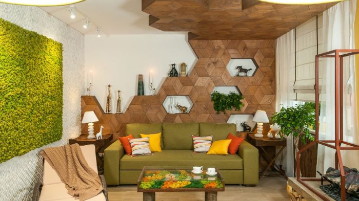 Натуральная древесина становится отличным декором не только для пола, но и для потолка. Такое оформление особенно уместным будет в эко-интерьере, ведь сочетание деревянной фактуры и зеленого цвета – беспроигрышное.