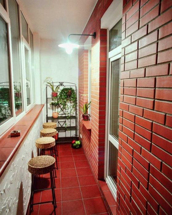 Отделка балкона красным кирпичом.
