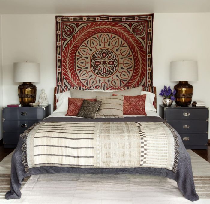 Ковер в изголовье кровати.Ковер над кроватью — привычное явление. Но располагается он, как правило, на стене вдоль ее боковой части. Ковер, повешенный в изголовье, выглядит нестандартно и становится украшением интерьера спальни.