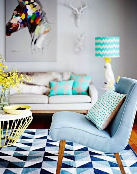 Чудесная гостиная, изюминкой которой стало обилие ярких цветов, гармонично сочетающихся между собой и создающих оптимистичное настроение и уютную атмосферу.