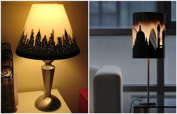 Очертания городских крыш, вырезанные из темной бумаги, наклеиваются на светлый абажур. Такая аппликация легко преобразит скучный однотонный светильник.