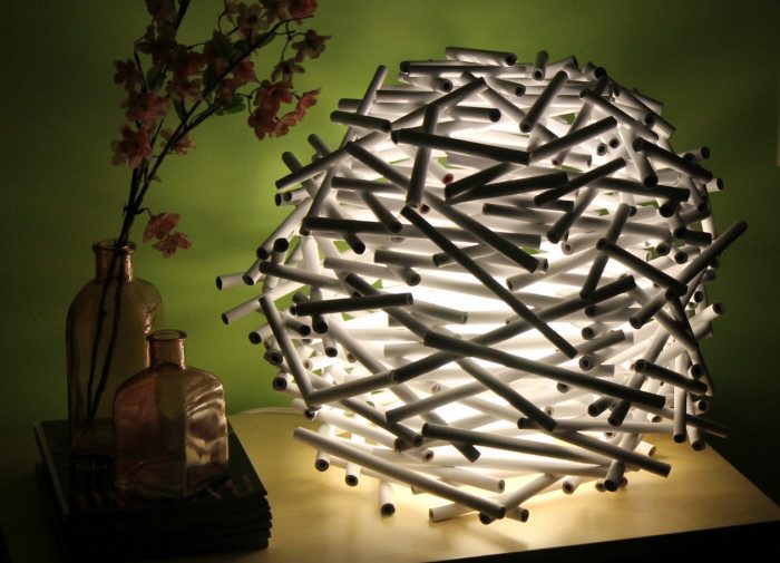 Пара вечеринок — и материал для светильника своими руками собран.Светильник из коктейльных трубочек выглядит демократично, но при этом эффектно. Прото приклейте трубочки одной из сторон на старый абажур при помощи силиконового клея. Если разрезать трубочки напополам, то светильник получится меньшего размера.