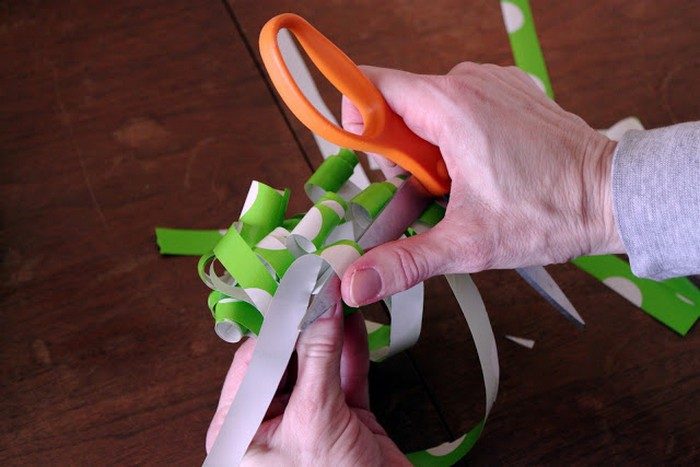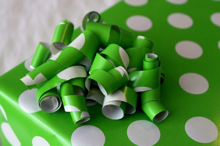 Давайте будем честны: как бы вы не убеждали себя, что обязательно используете бумагу повторно для упаковки подарка, это происходит примерно раз в никогда. Зато даже повреждённая обёртка сгодиться для того, чтобы сделать нарядный бант. Нужно только порезать её на тонкие полоски и сделать завитки ножницами.