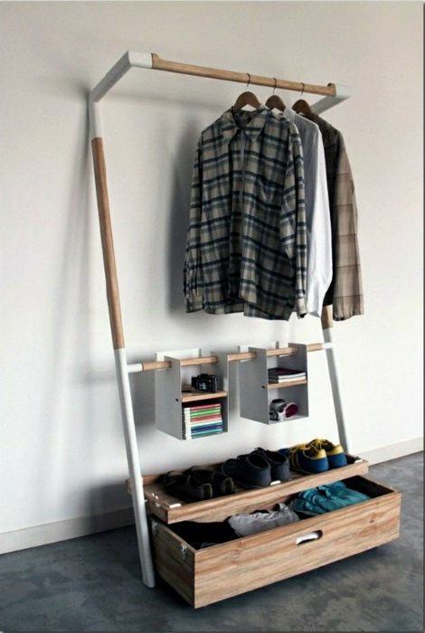 Стильный открытый шкаф, состоящий из перекладины для одежды, двух удобных коробок для мелких вещей, просторного ящика для свитеров и футболок и подставки для обуви, который можно собрать и разобрать буквально за пятнадцать минут без гвоздей и клея, что, несомненно, очень удобно для людей, вынужденных часто переезжать.