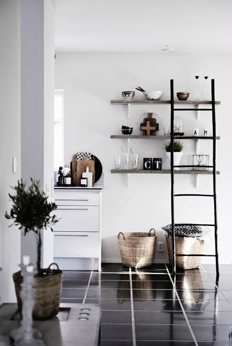 Белоснежная кухня с черным блестящим полом, темной приставной лестницей и открытыми полками из грубого дерева.