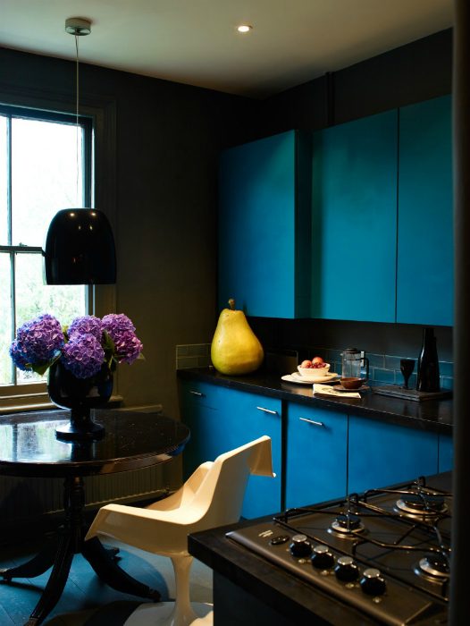 Стильная темная кухня с бирюзовыми шкафчиками.