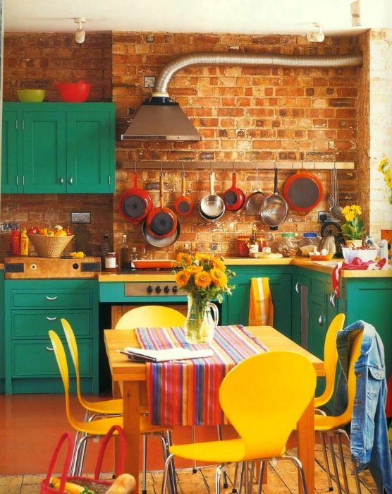 Очаровательная кухня, оформленная в теплых тонах с кирпичными стенами, мебелью зеленого и желтого цвета, и обилием яркой посуды, которая помимо своих основных функций, выполняет еще и декоративные.