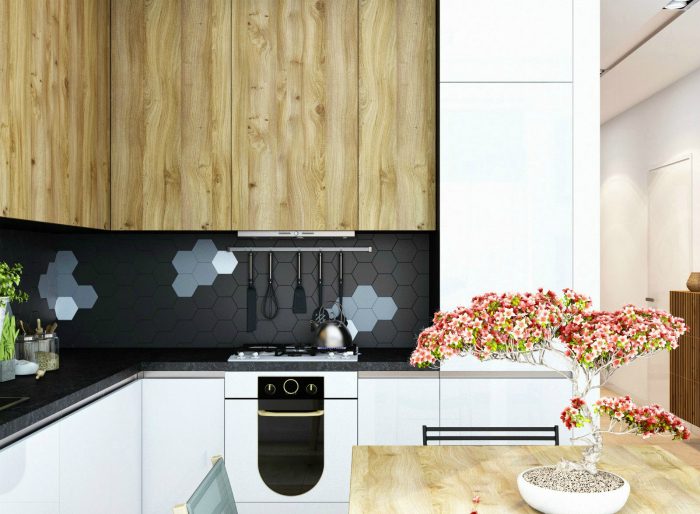 Стильный интерьер небольшой кухни, изюминкой которой стала оригинальная отделка фартука модной в этом году шестиугольной плиткой, похожей на соты.