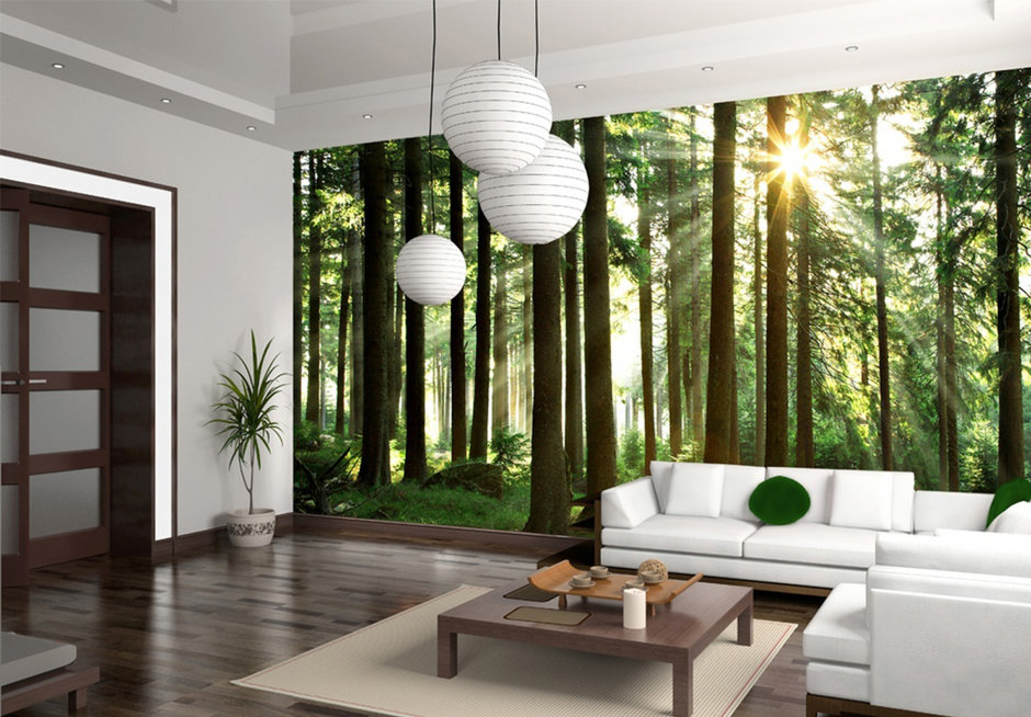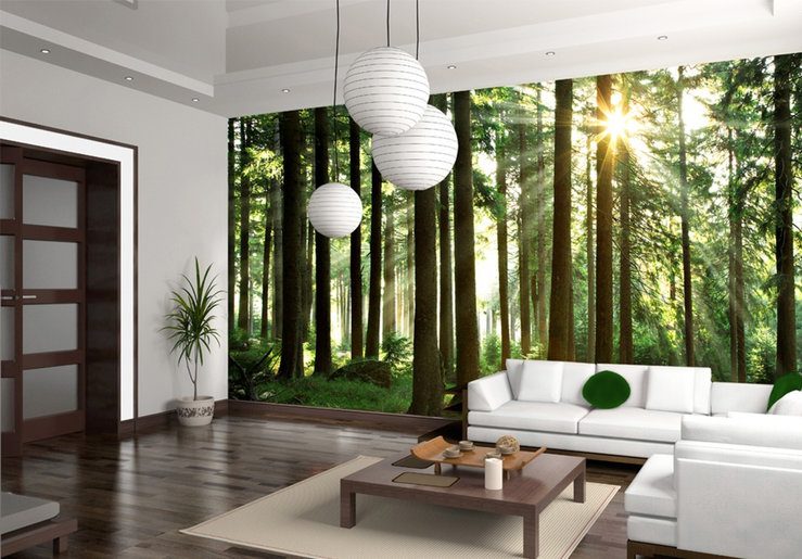 Не стоит декорировать оклеенную фотообоями стену картинами, вешать на нее телевизор или полки. В противном случаее вы лишь нарушите восприятие изображения и перегрузите интерьер. Все эти предметы всегда лучше расположить на стенах сбоку.