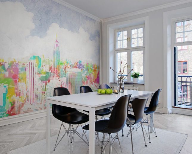 Не забывайте про колористику! Вполне возможно использовать технику колор-блок и выбрать обои контрастирующего цвета, если вы оформляете помещение в стиле хай-тек, контемпорари или бохо. Для более спокойных и классических интерьеров выбирайте фотообои, гармонирующие с основными цветами мебели и стен.