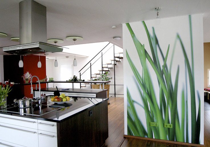 Фотообои с рисунком, от которого рябит в глазах, перегружают нервную систему и выглядят навязчиво. К сожалению, не лучше выглядят и изображения в масштабе десять к одному: гигантские цветы или сильно увеличенный в размерах луг с травой. Гармонично смотрятся фотообои, на которых предметы изображены в более или менее реалистичном масштабе.