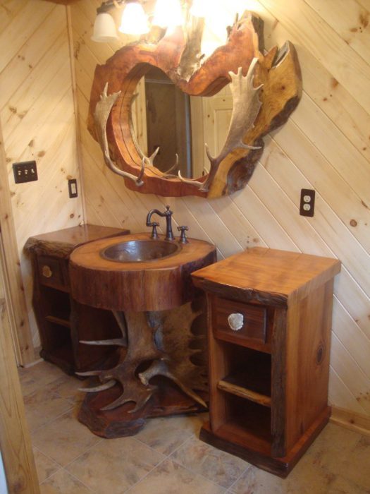 Оригинальный дизайн ванной комнаты с деревянной мебелью.