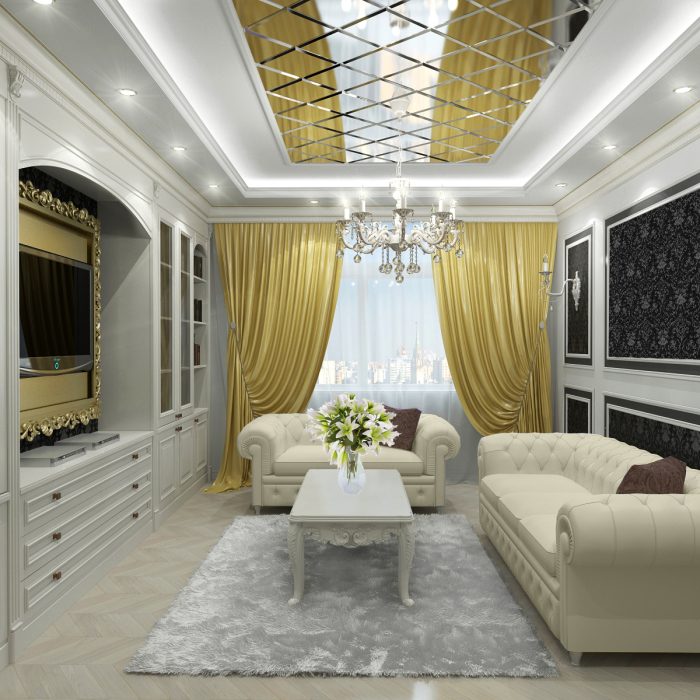 Позолоченные элементы в дополнении к стильному дизайн-проекту гостиной комнаты.