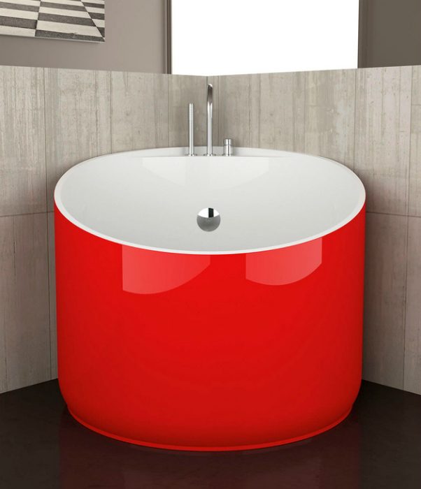 Круглая глубокая ванна красного цвета станет яркой деталью небольшого санузла.