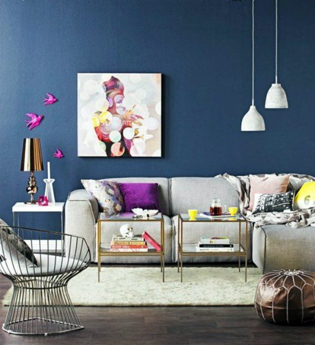 Элегантная гостиная с насыщенными синими стенами, светло-серым диваном и чудесными яркими деталями в виде сиреневой подушки, птичек на стене, оригинальной картины и предметов декора желтого цвета, которые делают это пространство уютным и по-весеннему теплым.