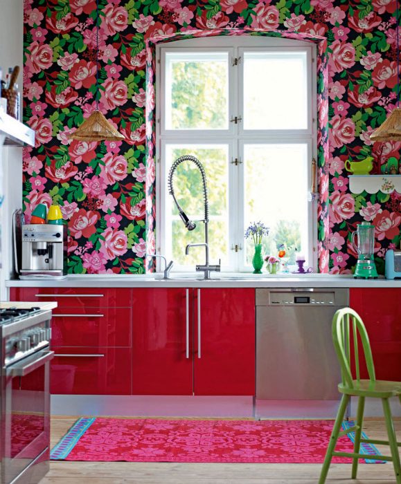 Современная кухня с глянцевыми шкафчиками ярко-красного цвета и эффектной акцентной стеной, украшенной красочными обоями с цветочным принтом, которые задают тон всему помещению и делают его насыщенным и весенним.