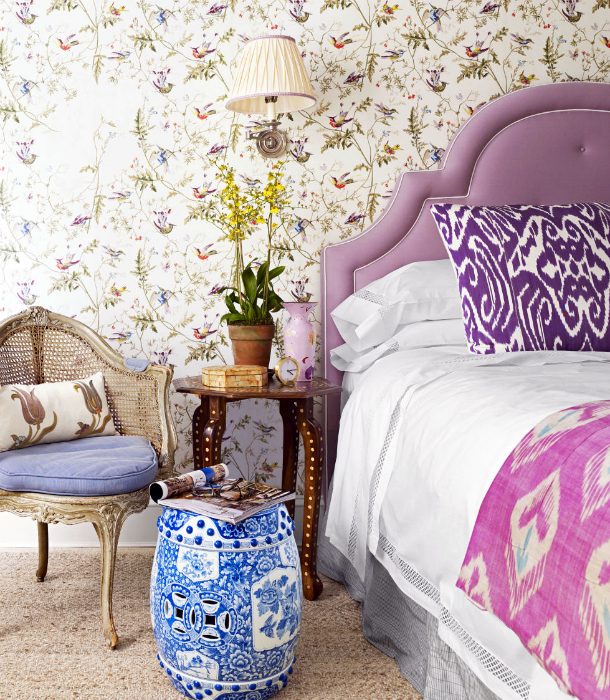 Кровать с сиреневым изголовьем стала центральным элементом этой уютной спальни, а обои с активным принтом, винтажный стульчик, оригинальные тумбы и глиняный горшок наполнили помещение жизнью и сделали его необычайно динамичным.
