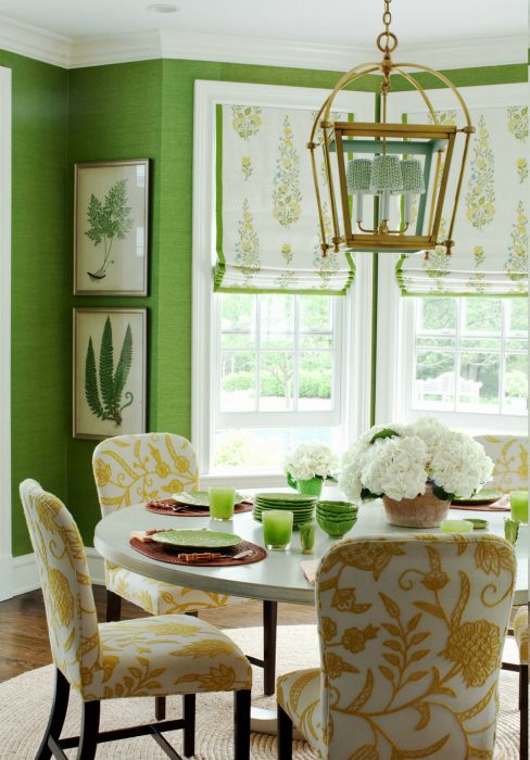 Жизнерадостный интерьер столовой с текстурными обоями цвета весенней зелени на стенах, круглым столиком и чудесными мягкими стульями, украшенными желтыми узорами.