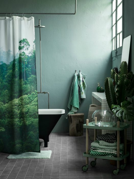 Прохлада и таинственность — первые ассоциации, которые приходят в голову при взгляде на этот чудесный интерьер ванной комнаты с белыми стенами, шторкой, украшенной реалистичным изображением леса и обилием живых растений.