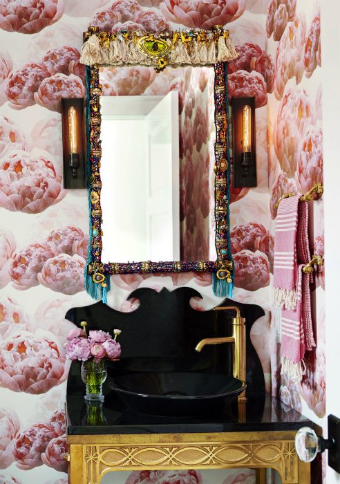 Роскошная ванная комната с элегантной черной сантехникой, оригинальным зеркалом и великолепными розовыми обоями, украшенными объемными изображениями цветущих пионов, которые подчеркивают красоту и молодость владелицы этого помещения.