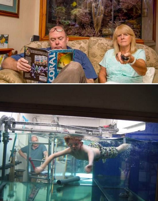 Домашних рыбок любят многие. Но явно не настолько, как Мартин Лакин, который практически разрушил свой дом, чтобы установить прямо в его центре 5000-литровый аквариум. Архитектор предупреждал владельца, что подобный странный ремонт может оставить его без жилья. Но Мартин решил рискнуть и установил дома настолько огромный аквариум, что до тех пор, пока не завезли рыбок, а нем купался его сын Джеймс.