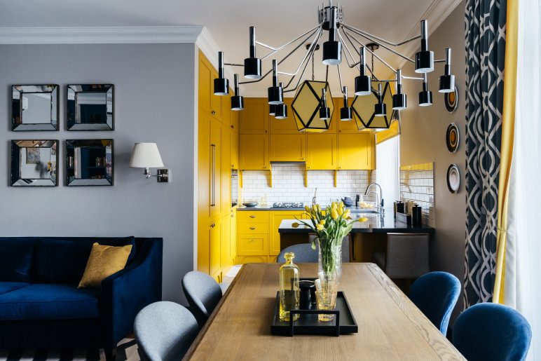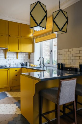 Взрыв цвета пришелся на канареечно-желтую кухню – этот цвет во всех традициях считается особенным. Желтый цвет – это солнечный свет, это золото, это позитивный взгляд на все происходящее вокруг. А китайская наука фэншуй настаивает на том, что он еще и увеличивает аппетит и удовольствие от еды.