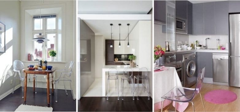 Сейчас появились столики со стеклянной столешницей и полностью стеклянная мебель, а также прозрачная пластиковая мебель. Такая мебель кажется невесомой и зрительно не крадет пространство маленькой кухни.