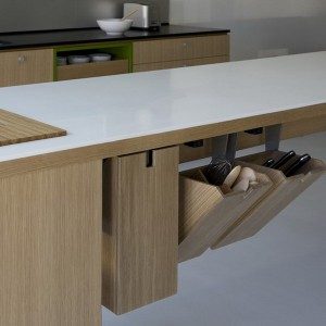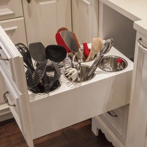 Ложки, лопаточки, шумовки — все это занимает много места. А используется не слишком-то часто. Если вы не хотите вешать все это на стену или же туда уже не помещается — замените один из ящиков у плиты на специальный со стаканчиками для утвари. Удобство то же, что и от аналогичного приспособления на поверхности, зато какая экономия пространства!