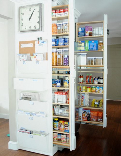 Если же вы — счастливый владелец просторной кухни, лучшее «скрытое» решение большой вместительности — «правильная» кладовка.Можно поискать готовый вариант, восхищающий количеством полочек и ящичков всех размеров. Или — самостоятельно продумать комплектацию из готовых модулей и спрятать за складными дверцами.