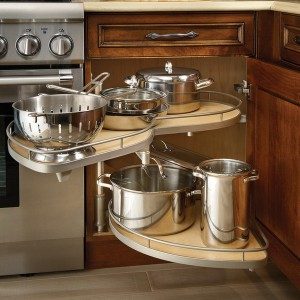 Установите в уголок, образуемый соседними тумбами (еще одна «мертвая» зона для большинства кухонь), крутящуюся полку — и полюбуйтесь, как можно навести порядок на раз-два! Кроме этого, туда можно установить и компактные выдвижные полки для хранения кастрюль и сковородок.