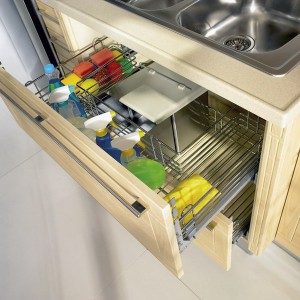 Правильно ли вы используете это дефицитное пространство? Дверцы могут быть неудобны, а ящики перекрывают доступ к трубам. Как решить эту проблему? Ответ прост — купить выдвигающийся ящик в форму буквы «П». Так вы легко получите доступ ко всему нужному, не трогая при этом коммуникации. В ящике можно хранить тряпочки, моющие средства, перчатки, запасные губки…Совет: если у вас есть дети, обезопасьте ящик специальным механизмом для защиты от «очумелых ручек». Теперь вы можете не бояться, что малыши доберутся до химикатов.