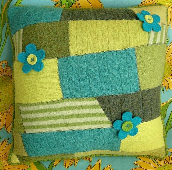 Мы уже упомянули про печворк – в том случае если у вас есть несколько разноцветных свитеров примерно одного качества, но у всех есть какие-то заметные дефекты (побиты молью, затяжки, прожжены), то можно нарезать их на одинаковые квадраты или прямоугольники и сшить лоскутную подушку.