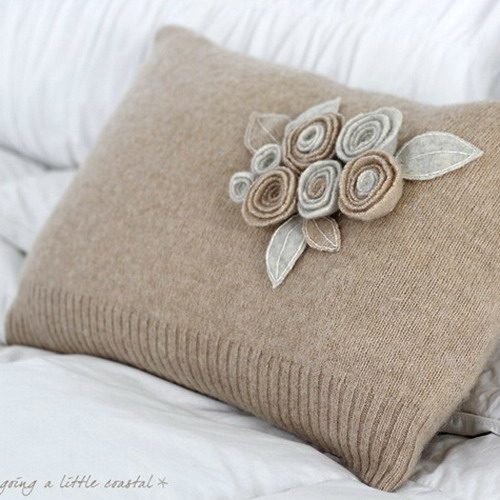 Это может быть бант из остатков материала, большие пуговицы, обшитые мягким материалом или обвязанные крючком, цветы из валяной шерсти или из рукавов и горловины. Прекрасно смотрятся на таких подушках аппликации – их можно делать из любого плотного материала и пришивать вручную. Такой способ отделки больше подходит к подушкам из гладких свитеров.