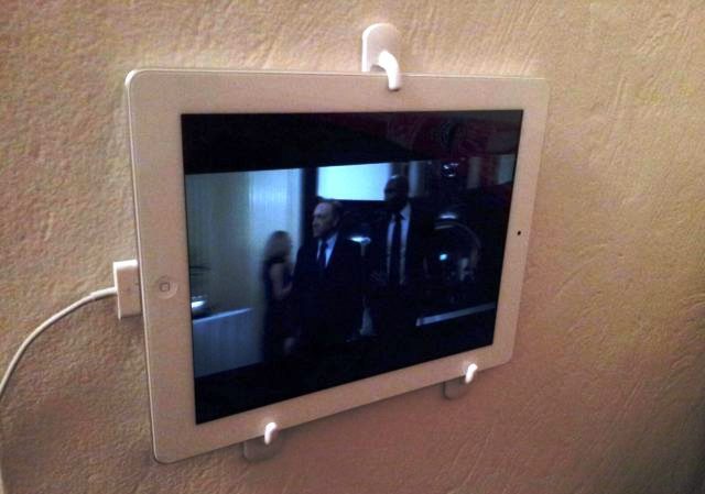 Если вам лень держать планшет во время просмотра фильма, вы можете прикрепить его к стене при помощи крючков. Таким образом, планшет будет играть роль телевизора, прикрепленного к стене.