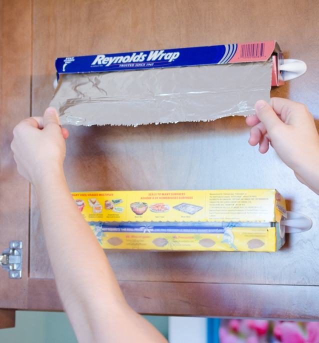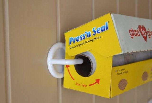 Если приклеить два крючка на нужном расстоянии друг от друга, заранее повернув их на 90 градусов, то можно прикрепить к ним рулон с пищевой пленкой, фольгой или бумагой для выпечки.