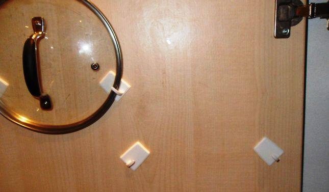 Если приклеить такие крючки к дверце шкафчика на кухне, то они смогут держать крышки кастрюль и сковородок, тем самым вы сохраните лишнее место для других вещей в шкафчике.