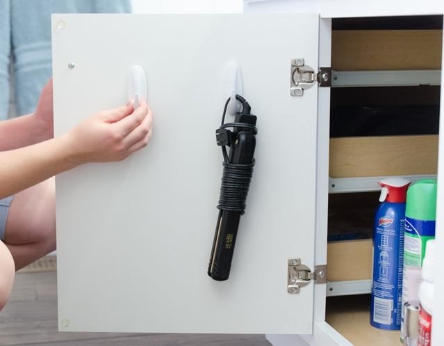 Если приклеить крючки к внутренней части дверцы шкафчика в ванной, то на них можно повесить фен, бритву или другие небольшие приборы.
