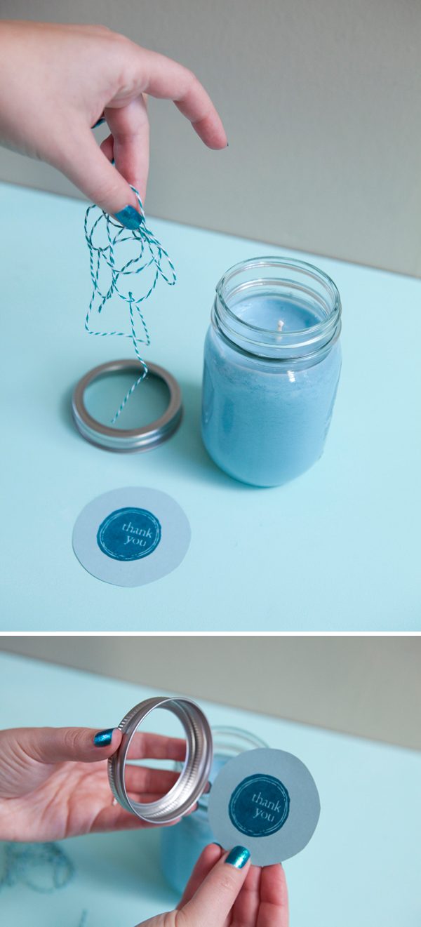 2. Возьмите наклейку и приклейте ее к металлическому основанию фитиля. Затем прилепите его на дно банки, чтобы фитиль твердо стоял на месте.