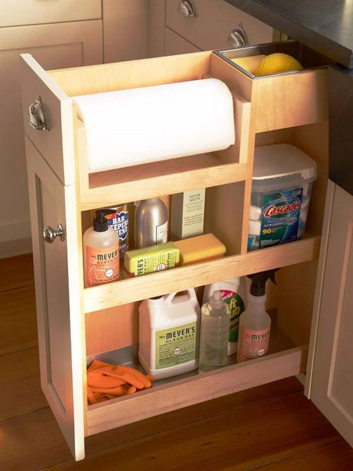 Следующее их преимущество – функциональность. Вы с лёгкостью сможете распланировать внутреннее пространство такого ящика, чтобы комфортно разместить химические средства для уборки, салфетки и полотенца, щетки и прочие инструменты.