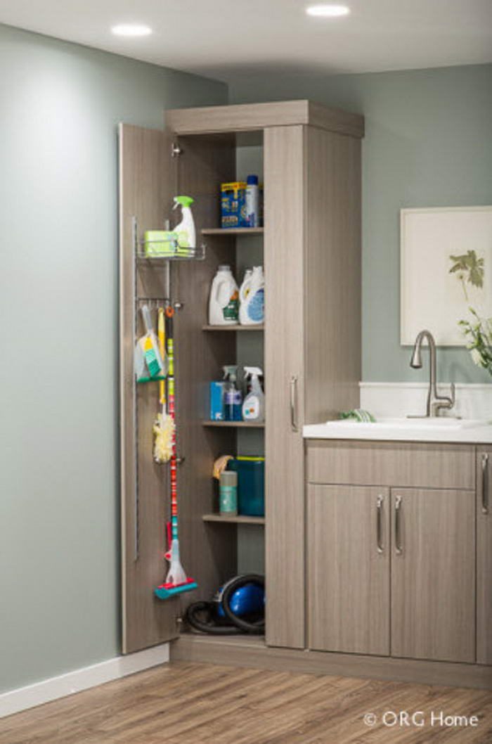 С одной стороны, они должны быть легкодоступны. Согласитесь, не хотелось бы выгружать половину содержимого ящика или кладовки, чтобы просто протереть пыль или убрать землю возле разбившегося цветочного горшка. С другой стороны, средства для уборки сложно назвать привлекательными элементами декора, поэтому предпочтительней укрыть их от посторонних глаз.