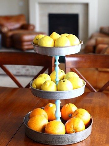 Три разного размера формы для выпечки и два старых подсвечника, поставленные друг на друга, без лишних усилий превращаются в винтажную этажерку для фруктов и сладостей. Если у вас много бижутерии, ее тоже можно хранить на такой этажерке. Больше идей для хранения украшений.