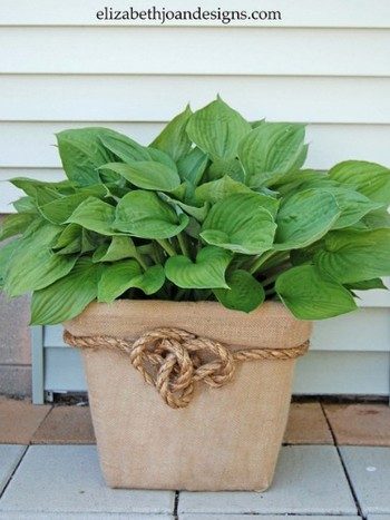 Старая плетеная корзина для белья еще может послужить в роли рустикального кашпо для цветов. Наденьте на нее чехол из новой мешковины, и поставьте внутрь горшок с цветком. Мешковину лучше для крепости приклеить клеем. Такое кашпо украсит крыльцо вашей дачи.Больше идей для дачи своими руками