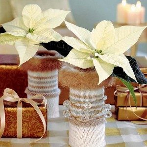 Кстати, из отрезанных рукавов свитера получится необычный вязаный чехол на самую тривиальную стеклянную вазу. Для этой цели можно также использовать старые вязаные перчатки (длинные), особенно шикарно, если они — с мехом по краю.