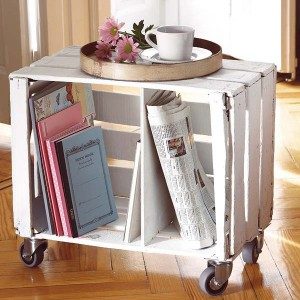 Обязательно зачистите дерево наждачной бумагой или шлифовальным бруском. Если у вас не рустикальный стиль — лучше покрасить. Если хотите получить стеллаж, — хорошо прикрепляйте ящики друг к другу. Если желаете мобильный предмет — поставьте на мебельные колесики.