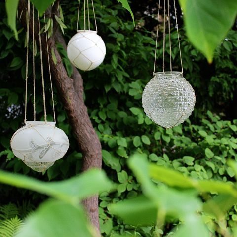 Если у нас сохранились плафоны, украсим ими сад. Повесим их на солнышко. И будем любоваться игрой солнечных лучей в стекле. Красиво.