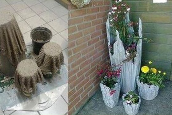 Старая ткань + цемент = Цветочные горшки! Можете ли вы поверить, что это просто? Вот инструкции: просто берём старые полотенца или ношеную одежду, замачиваем их в растворе цемента. Тут же драпируем их на подставке (табурет, банки, вёдра) и даем высохнуть. И, наконец, красим их в нужный нам цвет. Креативные горшки для растений готовы.