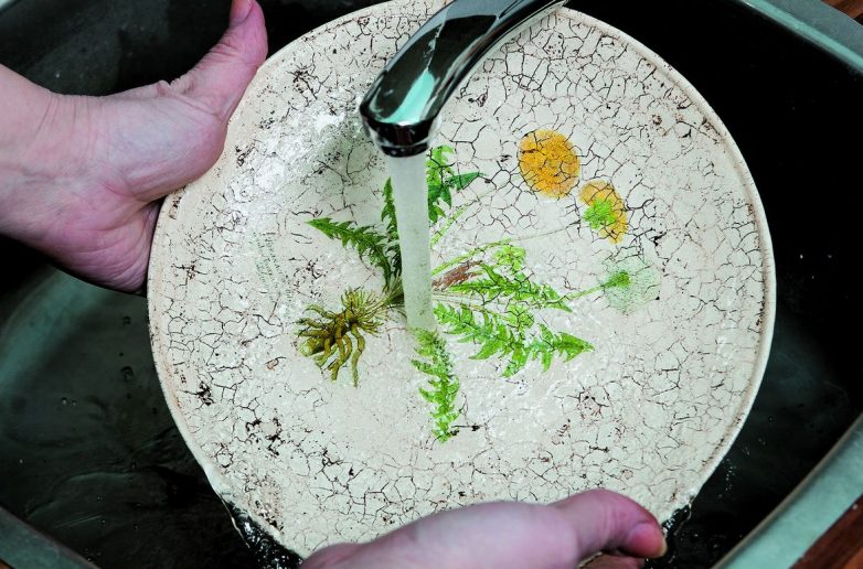 Теперь нужно смыть гумиарабик. Смывайте его под струей воды около 5 минут.Если битум образовал на поверхности пятна, их можно аккуратно удалить ватной палочкой, смоченной в уайт-спирите.Высохшую поверхность снова покройте шеллаком. Дождитесь полного высыхания лака (не менее 30 минут).Поверхность покройте любым акриловым лаком на водной основе (нанесите 5-8 слоев). Каждый высохший слой (кроме последнего) обязательно шлифуйте мелкозернистой наждачной бумагой, чтобы тарелки стали гладкими, похожими на керамические.