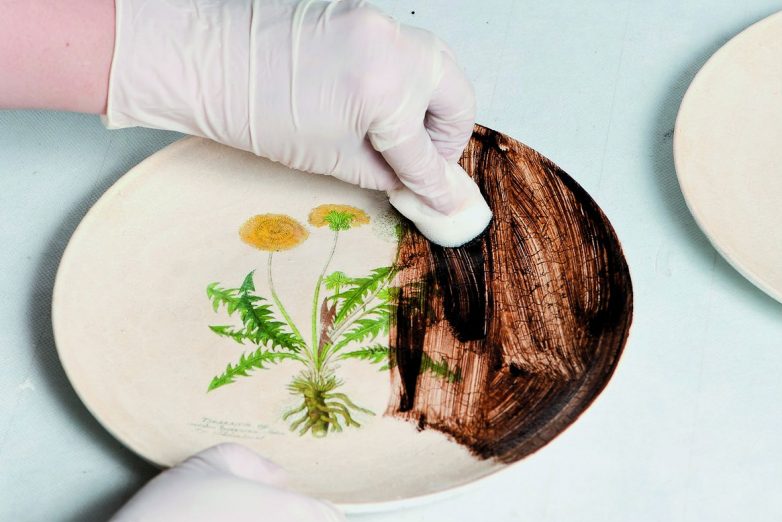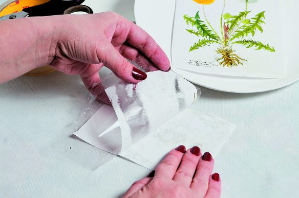 Для декорирования тарелок (прозрачных или обычных керамических) на лазерном принтере распечатайте копии страниц книг по ботанике. Кроме того, для работы вам потребуются шеллак и гуммиарабик.