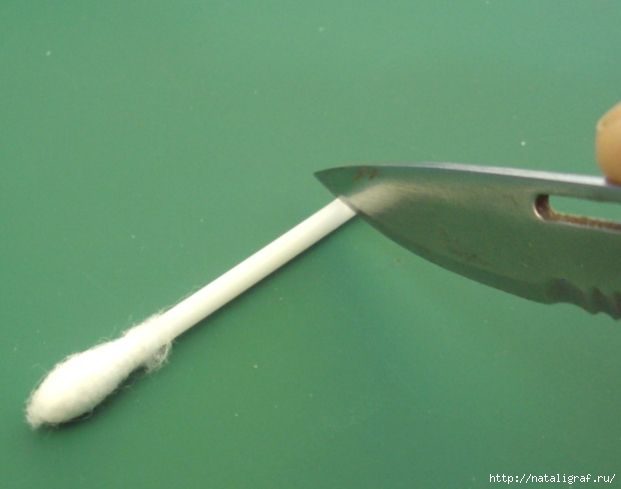 Берем ватную палочку, отрезаем от палочки часть ствола мм 2,5 длиной, надрезаем его вдоль по всей длине