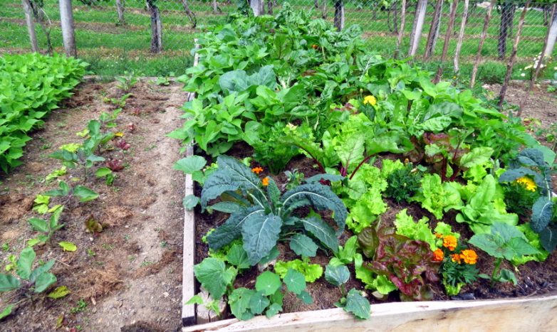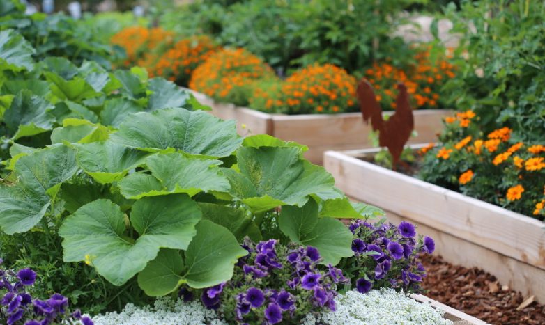 Придать композиции дополнительный объем, чтобы огород не казался плоским, поможет вертикальное озеленение: это могут быть кабачки, тыквы, огурцы, фасоль, бобы или горох, закрепленные на опорах. К ним можно добавить и цветущие декоративные растения, например, календулу, тагетес, настурцию, которая отгоняет вредителей.